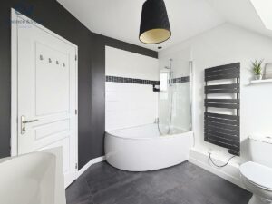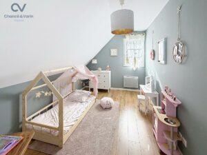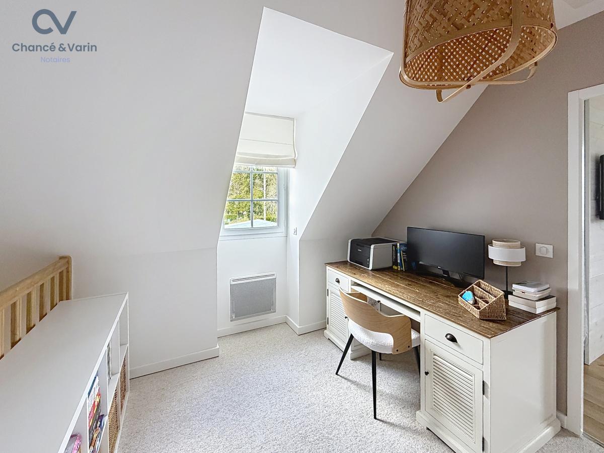 À l’étage, un palier aménagé en bureau dessert trois chambres, dont une avec double dressing, ainsi qu’une salle de bains avec baignoire, double vasques et WC.