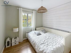 Édifiée sur un terrain plat, clos et arboré de 2 000 m², la propriété dispose également d’une agréable terrasse en bois.