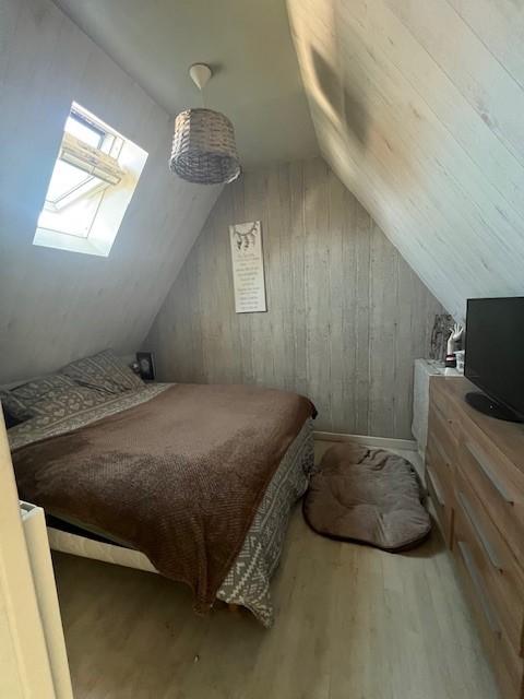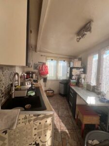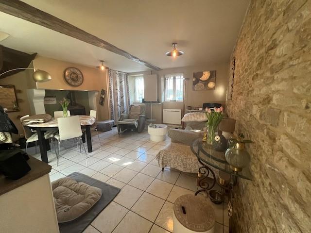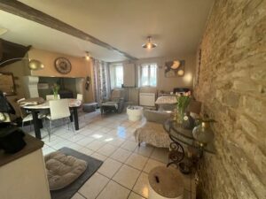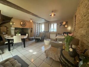 MEZIDON CANON, maison de ville construite en pierre mitoyenne d’un coté comprenant au RDC : cuisine, séjour-salon avec poêle à bois, salle d’eau et wc. Au 1er étage : bureau, une chambre. Au 2ème étage : petite chambre, salle de bains. Garage au fond du jardin. Jardin agréable de 502 m².