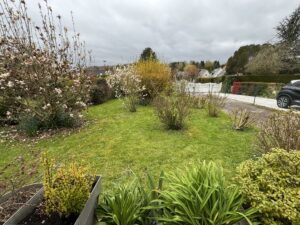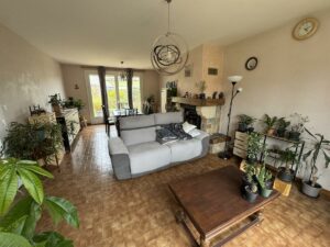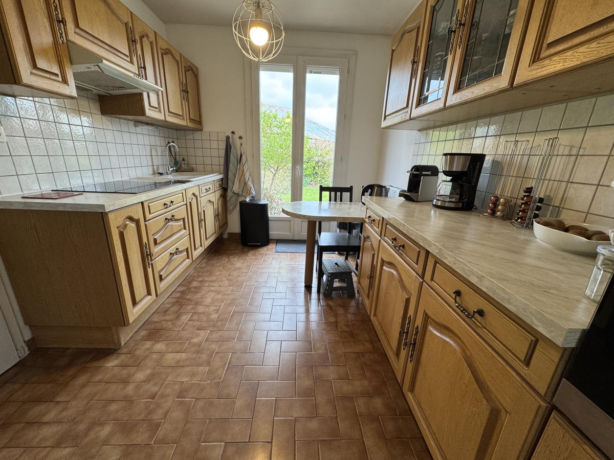 RDC: entrée, séjour-salon avec insert, cuisine aménagée, cellier, wc et garage.